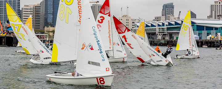 Today was the first day of racing for the LaserPerformance Team Race National Championship on North San Diego Bay co-hosted by San Diego Yacht Club and the Pacific Coast Collegiate Sailing Conference. Sixteen collegiate teams from across the nation qualified to compete in this event for the national title and the Walter C. Wood Trophy, awarded to the winning team.